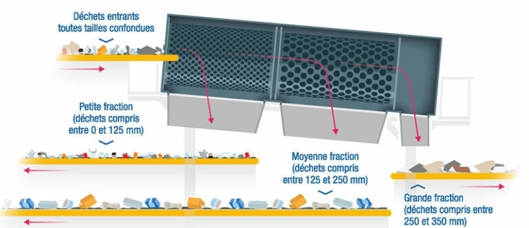 Les déchets recyclables sont ensuite dirigés dans un trommel afin de réaliser une séparation par taille des déchets par tri granulométrique.
