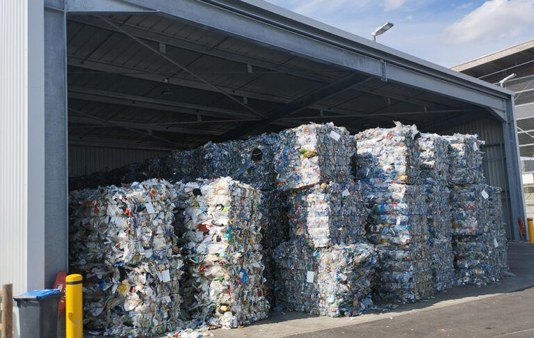 Les balles plastiques comme le PET ou le PEHD sont stockées sous l’auvent.