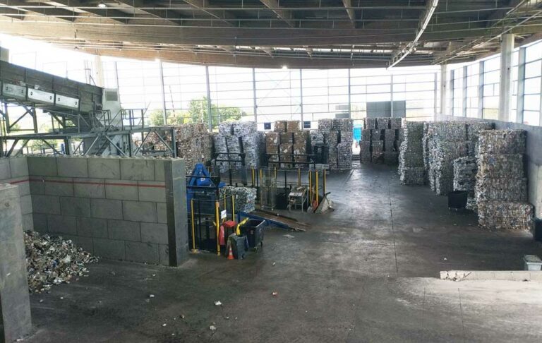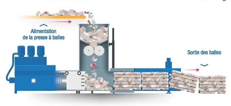 Pour optimiser le stockage et le transport des matières vers les unités de recyclage, les matières sont compactées et mises en balles.
